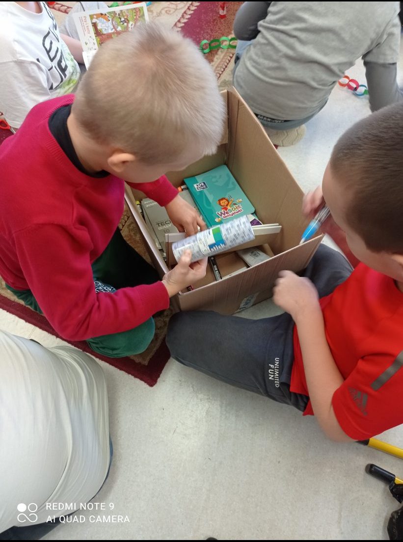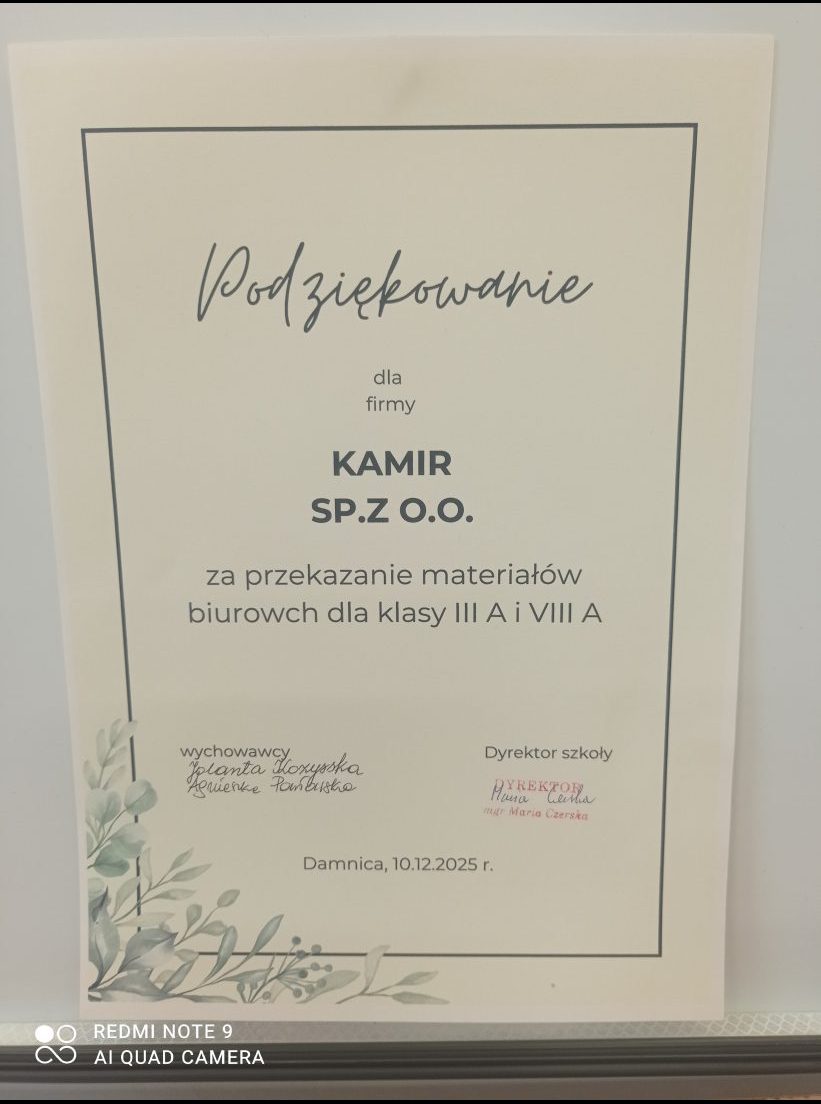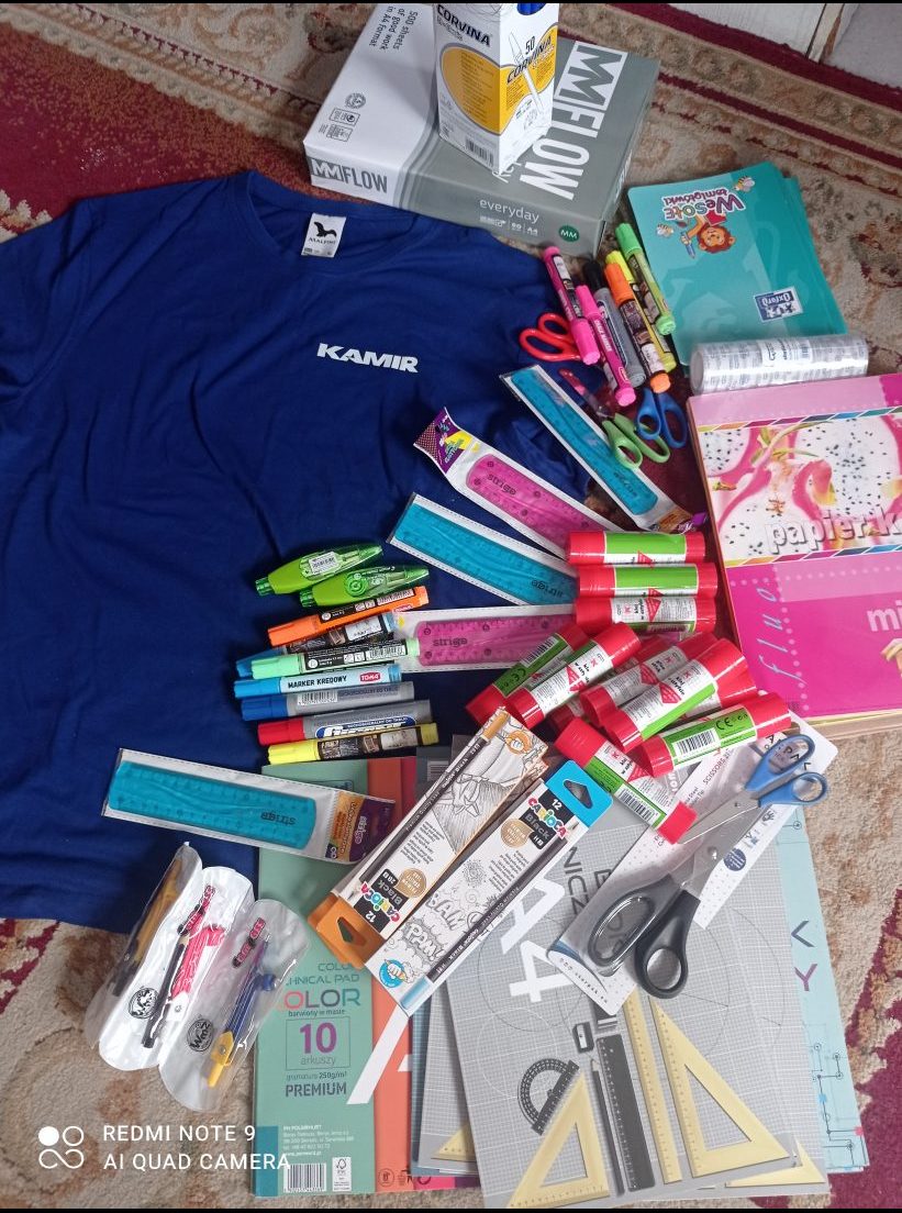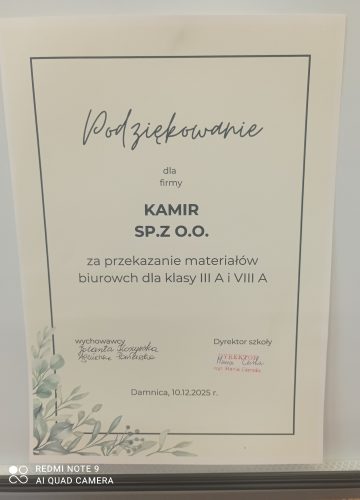 Przed zbliżającymi się  świętami uczniowie naszej szkoły otrzymali paczkę z różnorodnymi materiałami papierniczymi oraz z  przyborami szkolnymi. Prezent przekazała szkole firma KAMIR SP. Z O.O.  w Słupsku.