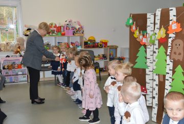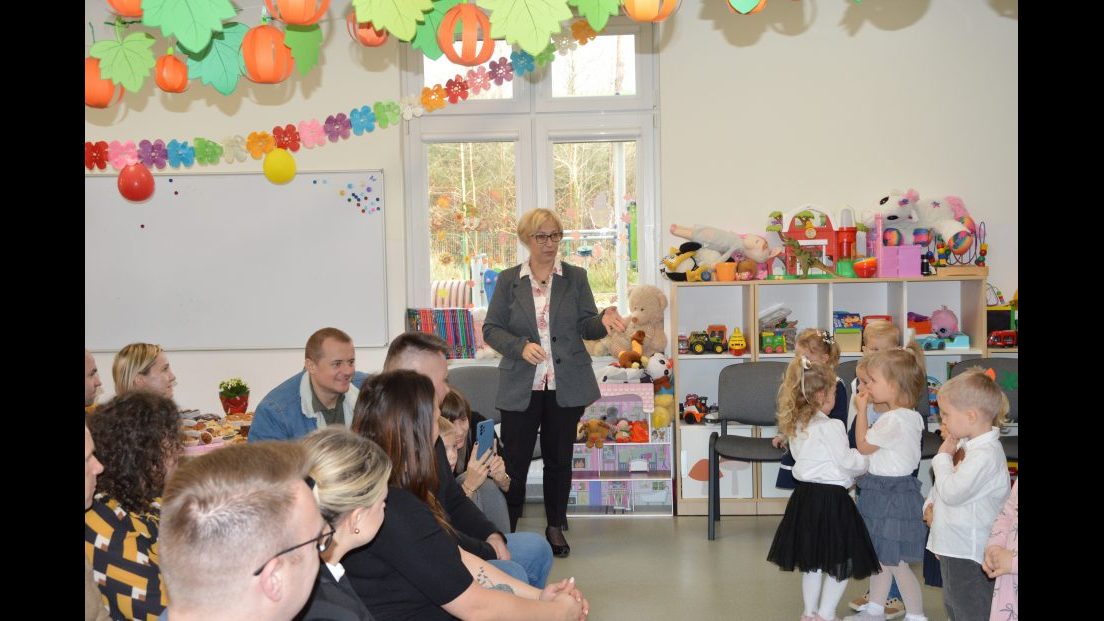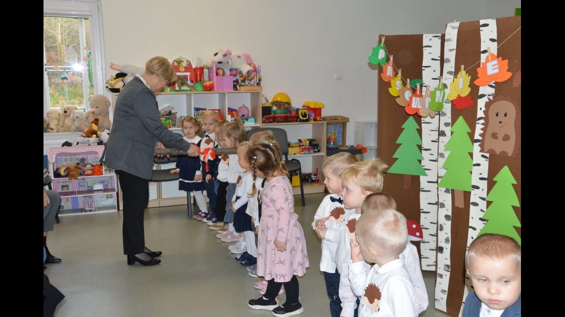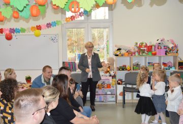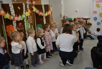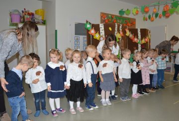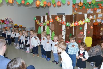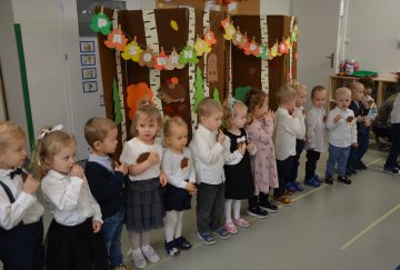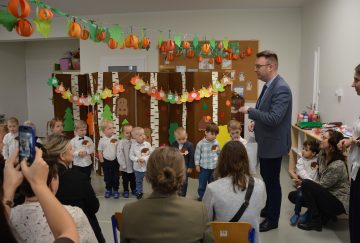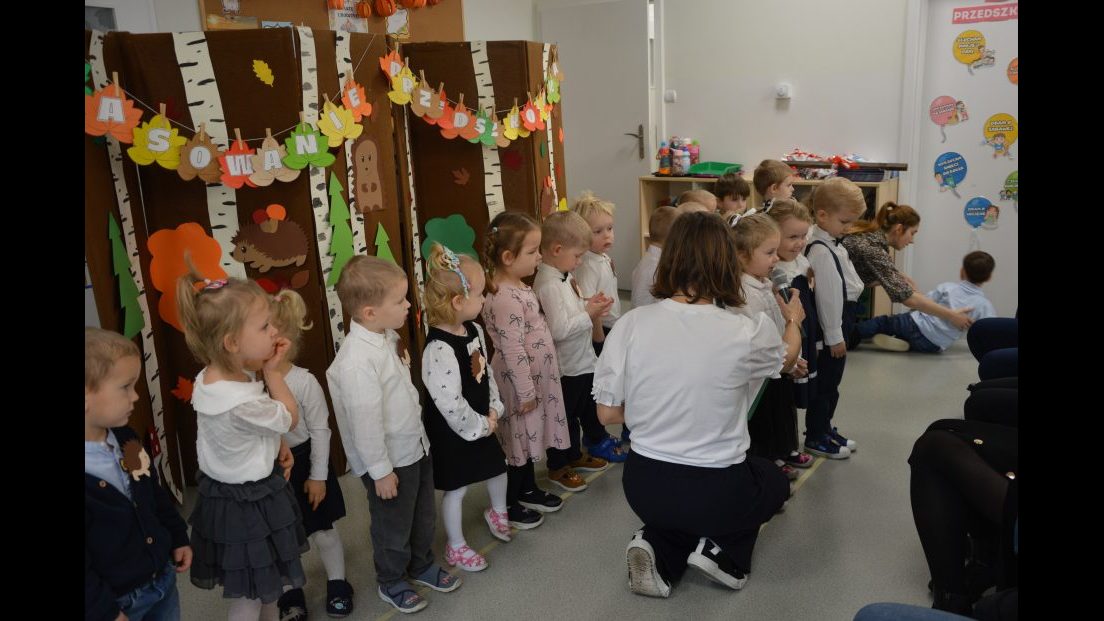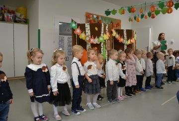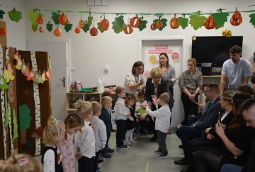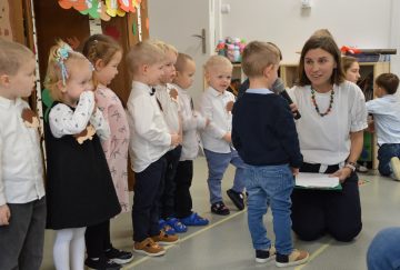 Dzieci z wielkim zaangażowaniem zaprezentowały przygotowany program artystyczny: piosenki, wierszyki i krótkie zabawy ruchowe. Po części występów nadszedł najważniejszy moment – uroczyste ślubowanie i symboliczne pasowanie na przedszkolaka przez panią dyrektor.
