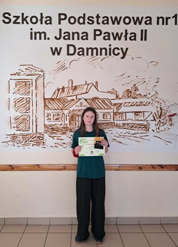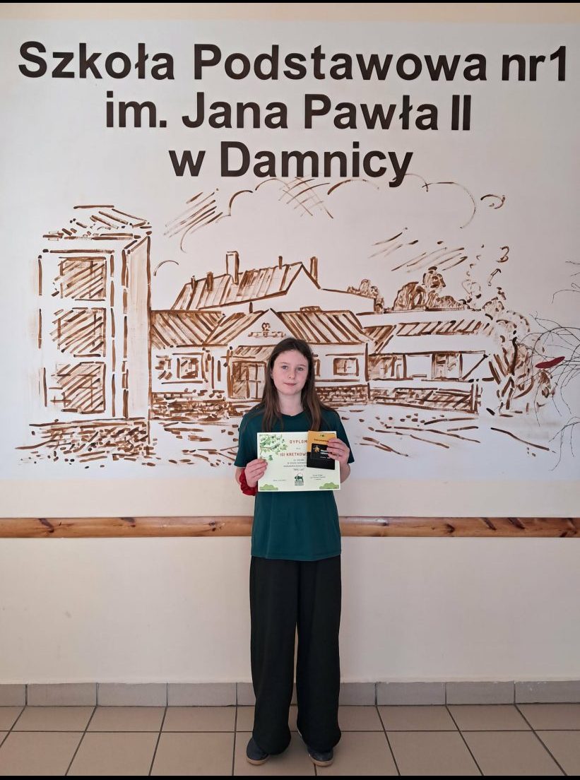 Uczennica klasy IV – Iga Kretkowska – wzięła udział w Ogólnopolskim Konkursie dla młodzieży szkolnej pod hasłem „MÓJ LAS” (XXXIX edycja 2025/2026), organizowanym przez Stowarzyszenie Inżynierów i Techników Leśnictwa i Drzewnictwa oraz Liga Ochrony Przyrody Iga przygotowała pracę w kategorii II pt. „Zapraszam na całodzienną wycieczkę do wymarzonego lasu i podwieczorek z leśnych smakołyków”. Jej zaangażowanie, kreatywność oraz wrażliwość na piękno przyrody zostały docenione przez komisję konkursową na szczeblu rejonowym. Uczennica otrzymała dyplom oraz kartę podarunkową.