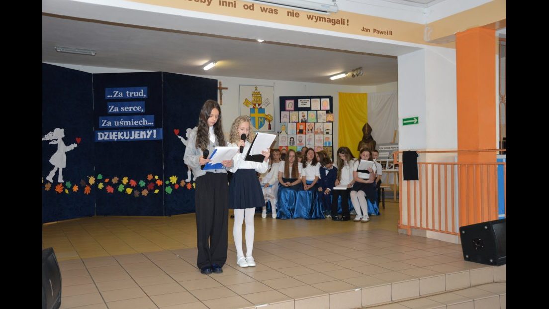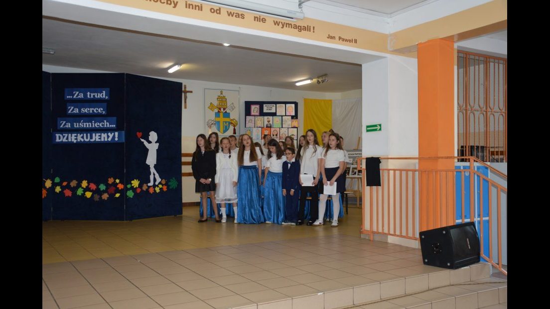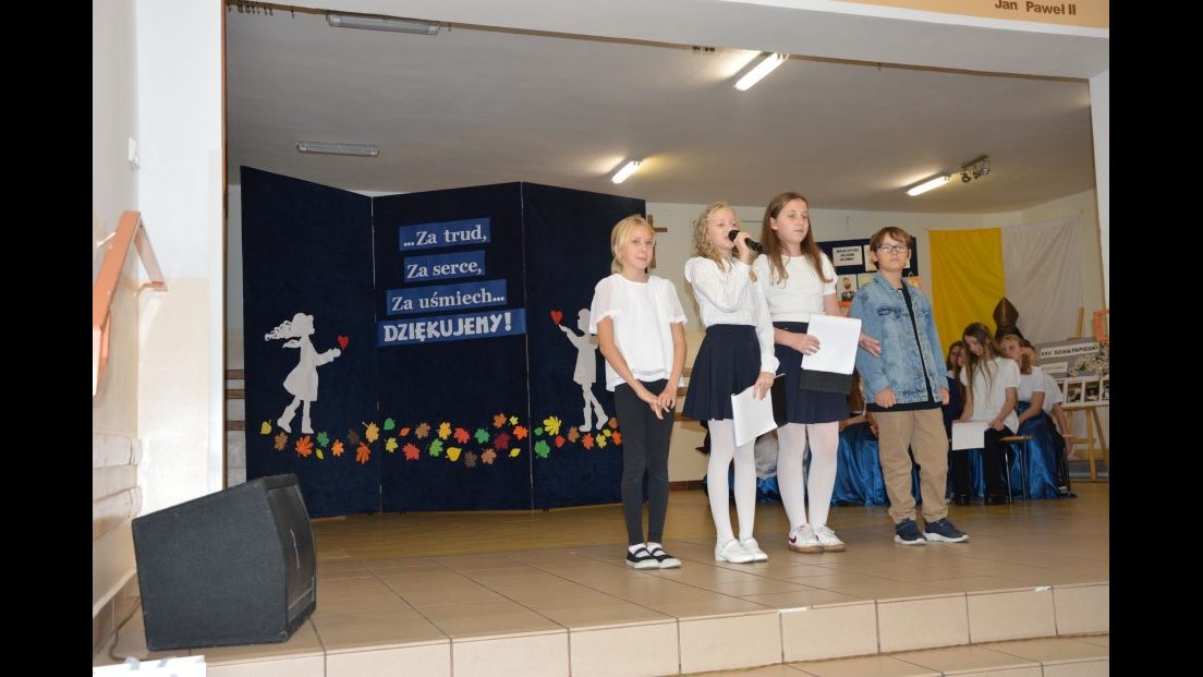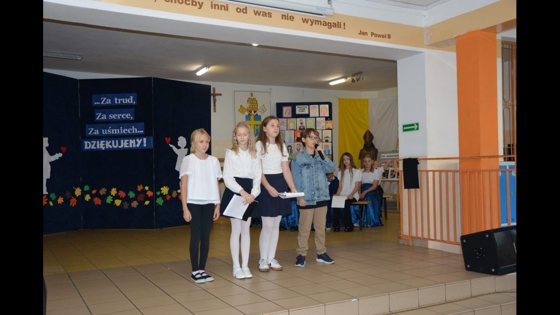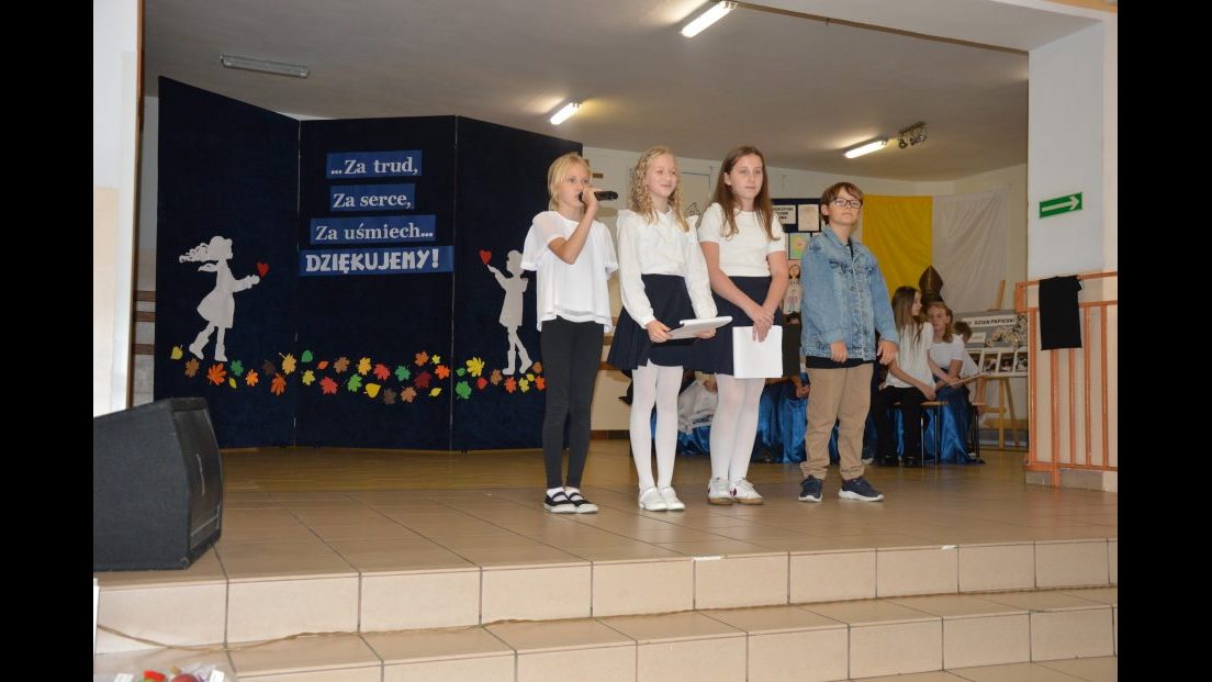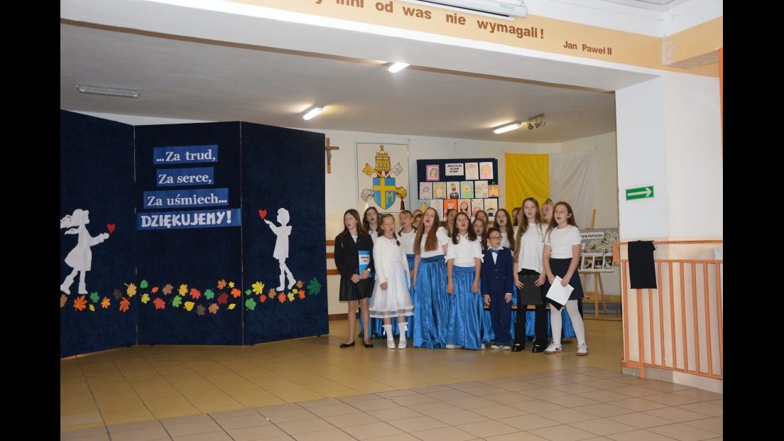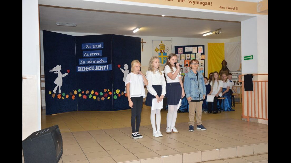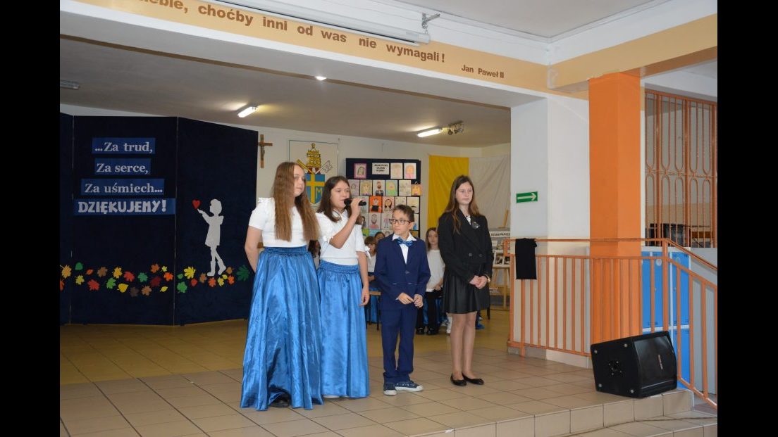 Apel przygotowali uczniowie klasy 4a wraz z wychowawcą Małgorzatą Dudzik, którzy z przymrużeniem oka zaprezentowali różne typy nauczycieli oraz uczniów. Były też życzenia, odświętne stroje i drobne upominki dla wszystkich pracowników szkoły przygotowane przez SU. Występy uświetniły piosenki w wykonaniu chóru szkolnego pod opieką Anny Zawadzkiej.