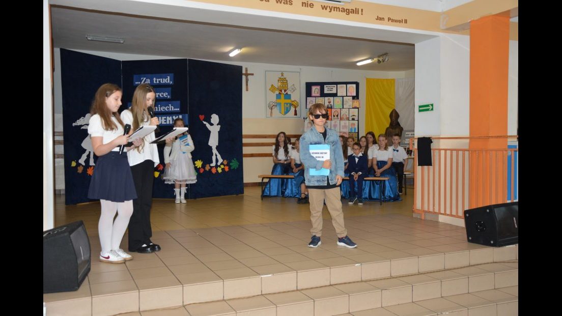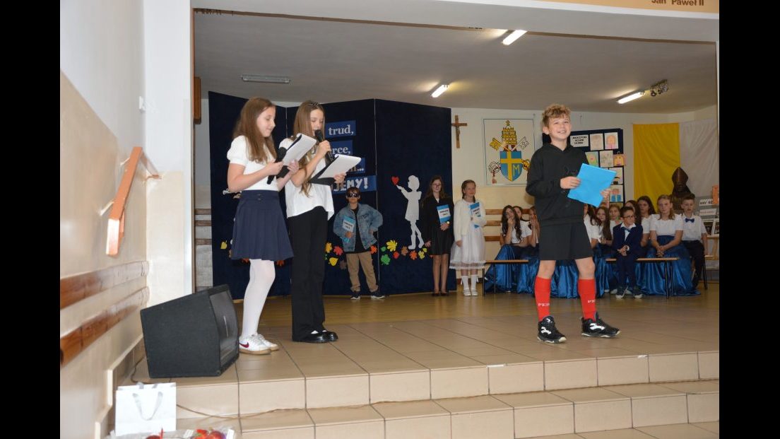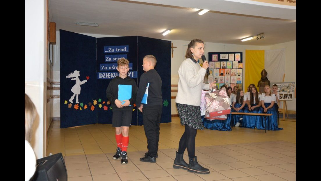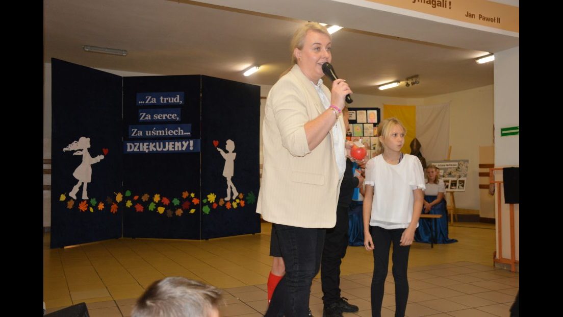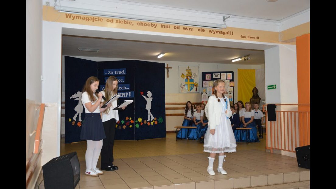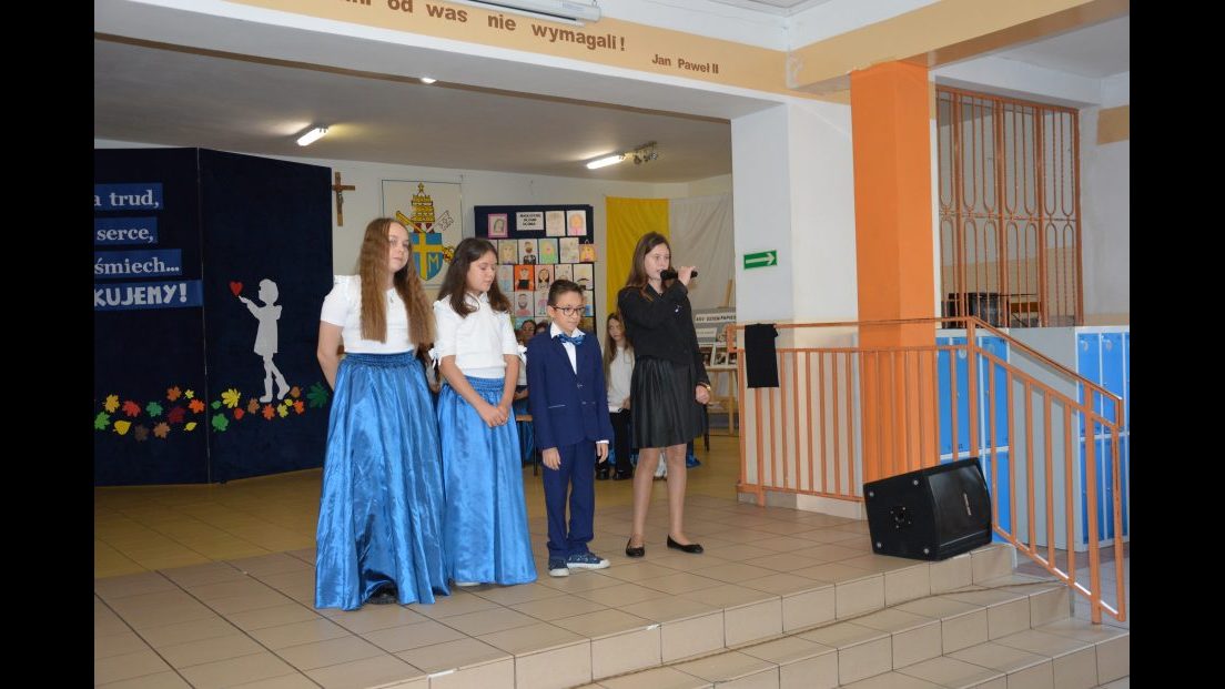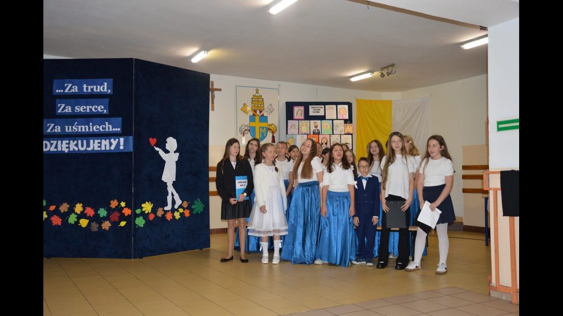 Apel przygotowali uczniowie klasy 4a wraz z wychowawcą Małgorzatą Dudzik, którzy z przymrużeniem oka zaprezentowali różne typy nauczycieli oraz uczniów. Były też życzenia, odświętne stroje i drobne upominki dla wszystkich pracowników szkoły przygotowane przez SU. Występy uświetniły piosenki w wykonaniu chóru szkolnego pod opieką Anny Zawadzkiej.