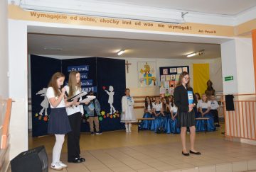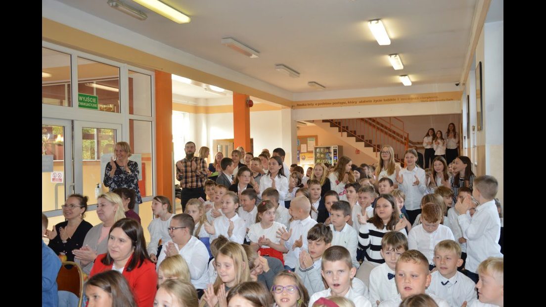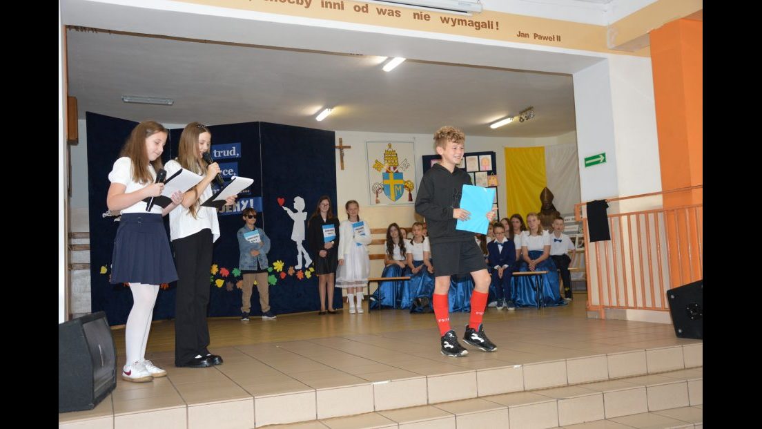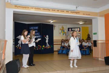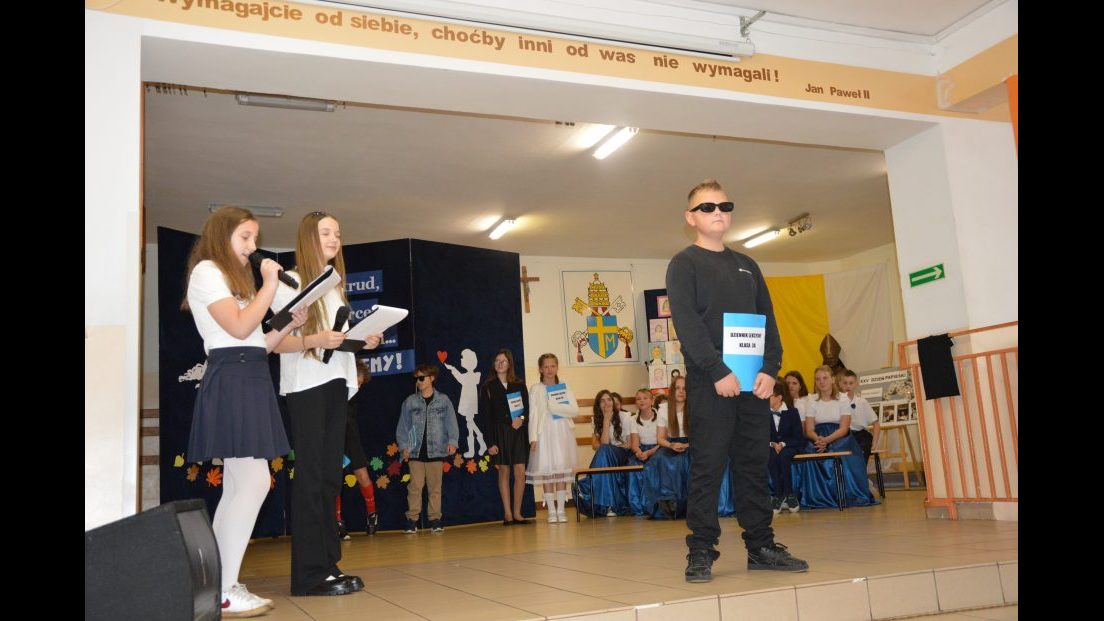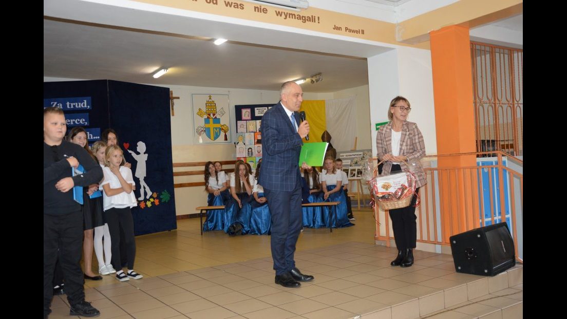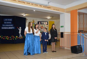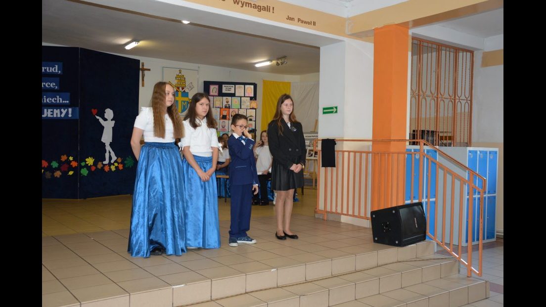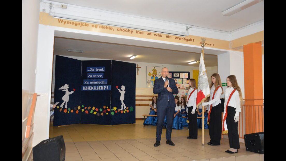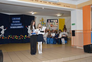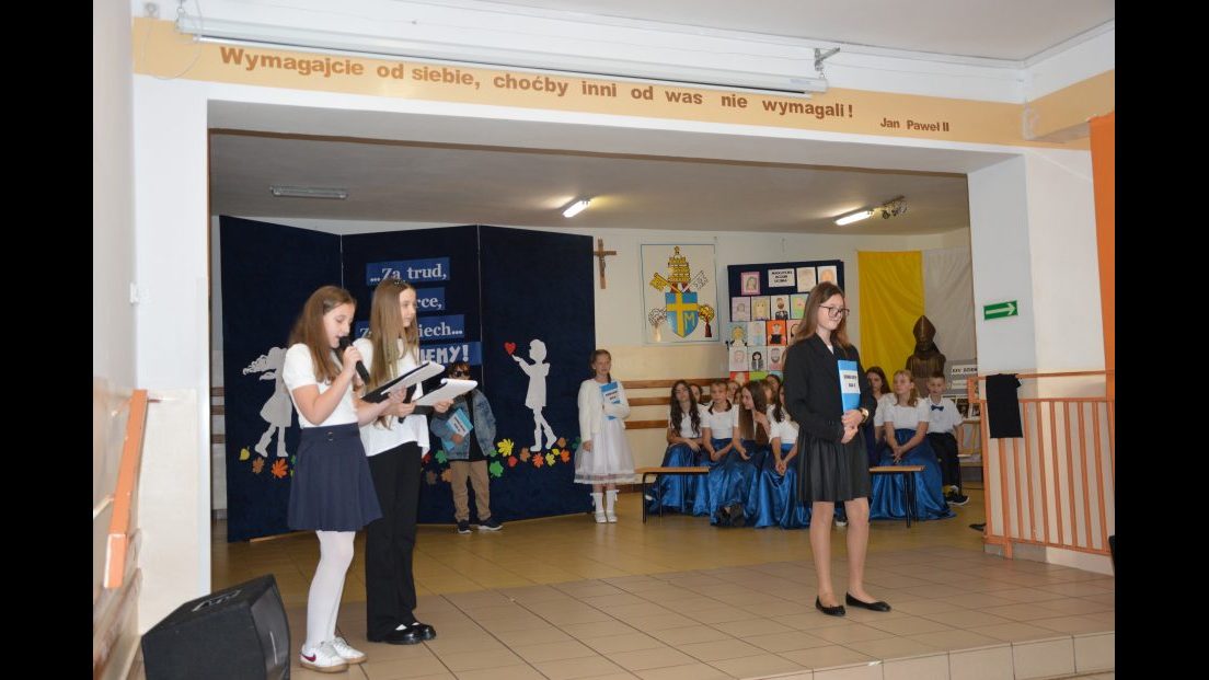 Apel przygotowali uczniowie klasy 4a wraz z wychowawcą Małgorzatą Dudzik, którzy z przymrużeniem oka zaprezentowali różne typy nauczycieli oraz uczniów. Były też życzenia, odświętne stroje i drobne upominki dla wszystkich pracowników szkoły przygotowane przez SU. Występy uświetniły piosenki w wykonaniu chóru szkolnego pod opieką Anny Zawadzkiej.